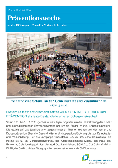 In unserer Schule sehen wir Prävention als ständigen Begleiter des Entwicklungsprozesses zur Förderung von Lebenskompetenz bei Kindern und Jugendlichen. Die Angebote unserer schulischen Präventionsarbeit stammen in der Regel aus den Bereichen der primären und sekundären Prävention: Demnach richtet sich die primäre Prävention unspezifisch an alle Kinder und Jugendlichen und versucht, unter anderem durch die Stärkung sozialer Kompetenzen Gefährdungen zu verhindern. Sekundäre Prävention wendet sich an konkrete, identifizierbar gefährdete Personen und Gruppen. Mit speziellen Programmen erhalten diese Unterstützung und Förderung.